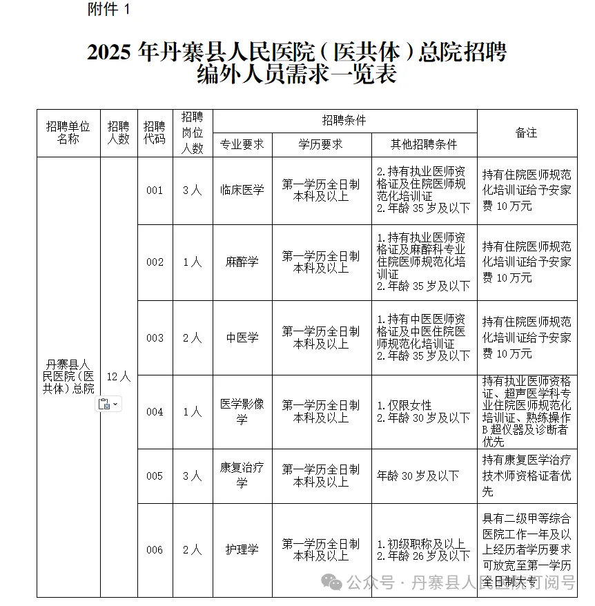 2025年丹寨县人民医院(医共体)总院公开招聘编外工作人员方案(12人,报名截至10月16日)