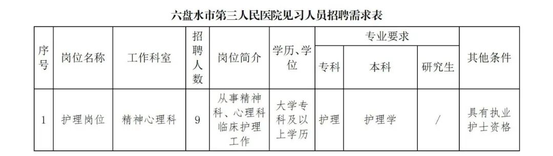 根据《省人力资源社会保障厅省发展改委等十一部门关于印发贵州省就业见习管理暂行办法(修订)的通知》《市人力资源社会保障局关于常态化开展就业见习工作的通知》精神,结合工作实际,六盘水市第三人民医院开展2025年青年就业见习招募(第三批次),现将相关事宜公告如下